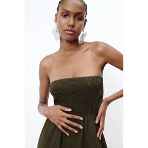 Zara Women's Dress Linen Blend Olive Green Smocked Size S NEW