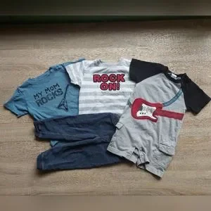 This listing is for a 4-piece toddler boy bundle. The two tees & the romper are from Gymboree's 2008 line "Rock On". The guitar romper & the "rock on" tee are in very good condition w/a bit of washwear. The "Mommy Rocks" tee has a bit more fade than the other Gymboree pieces so it is between good & very good used condition.