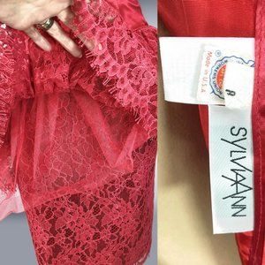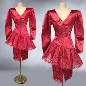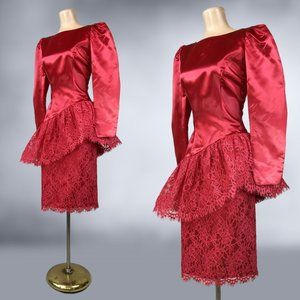Vintage 80s Red Satin and Lace Peplum Cocktail Party Dress by Sylvia Ann Size 8
