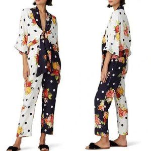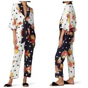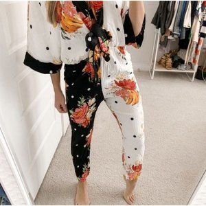 Farm Rio Mixed Nanaju Jumpsuit in Black White. Size M / Medium. Features tie collar, kimono sleeves, v-neck, slim fit, polka dot and floral print throughout. 55% rayon, 45% viscose. Overall excellent condition, minor wear on spot as photographed