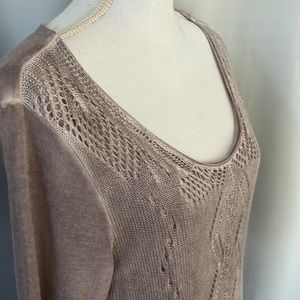 Two layered tunic, light sweater with tee shirt fabric/ lace and gauze underneath. Can either be worn as long sleeve or rolled to 3/4 length with button tab. Scooped neck, pink/mauve color. Slight manufacture color flaw on front as pictured. Size L