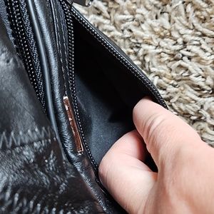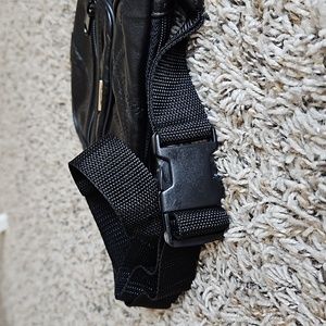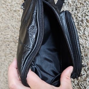 Black, leather fanny pack for on the go. In excellent pre-owned condition. 4 zippered compartments and an adjustable waist band. All over stitched patchwork.