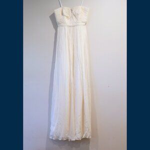 This dress is all about the shirred strapless bodice: First, our designers gathered and stitched the crinkled silk chiffon to create a cool sunburst effect, then they added a notch detail at the neckline to give it a modern edge. The skirt’s flowy, lightweight layers are ideal for tropical beach ceremonies (with jeweled sandals and a statement necklace) but look equally alluring in ballrooms and backyards.