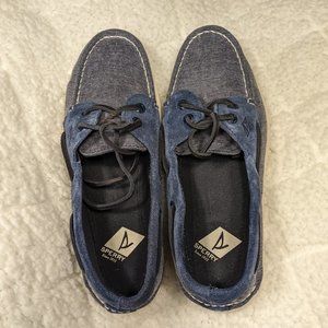 New without tags. Sperry deck/boat shoes. Denim with leather ties. Navy