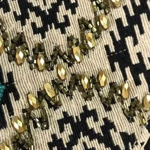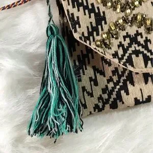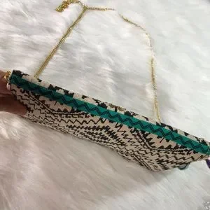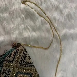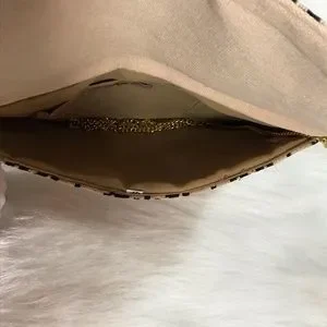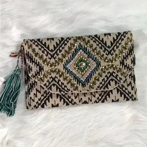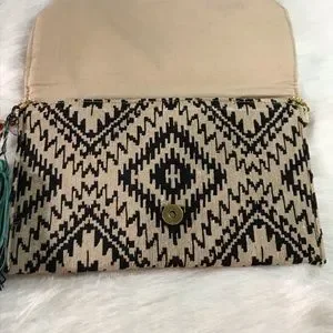 NWT Beautiful beaded clutch with gold chain link crossbody strap. The body is a tan and black fabric. Gold and turquoise beads decorate the front with a black and turquoise tassel charm on the side. The chain is not removable but can easily be tucked into the compartment as shown in the pics. Snap enclosure. One compartment with interior side pocket. Not a ton of room but enough for a night out.