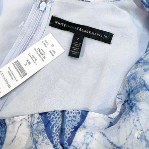 This gorgeous blue batik inspired print halter style midi dress from White House Black Market features a very subtle metallic clip dot detail. This dress is fully lined throughout the bodice and skirt. The A-line silhouette is fitted at the bust and transitions at the waist sweeping away from the body into a breezy, flowing skirt. Hidden back zipper with hook and eye. Delicate gathered detail at waist. Machine washing or dry cleaning recommended. The condition of this dress is unworn New With Tags with no blemishes, spots, or snags. Size 2.