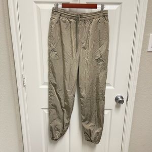 Top size 1/2 and bottoms size 2. Shiny taupe quarter zip pullover jacket and pull on elastic drawstring waist jogger pants. Windbreaker material. Top has a few spots on the front but blends in with the shine and way it falls. Otherwise good condition. No trades. DJ