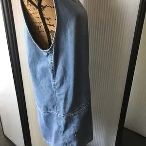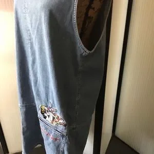 Fun summer blue jean jumper. Embroidering oh Looney Tunes and That’s All Folks. 100%cotton two front pockets. 16” back zipper 20” pit to pit 36” shoulder to hem. Size XLG fits women’s 12/14. Bag#12