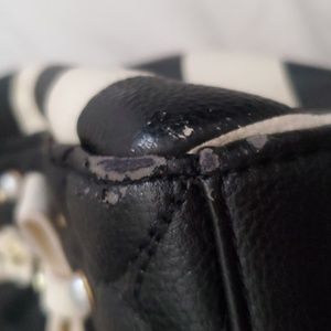 This is a Super Cute Betsy Johnson Bag. It is lightly padded on front w/heart designs. It's black pebbled w/black/white pebbled pleather(not gonna lie) on the sides. It is Blingy on Front interior w/tiny white bows n gold-toned hardware n a large black bow w/gold-toned hearts on it. Decorated with pearls n tiny flowers also. This is a tote style bag. Measurements are listed also. Please see All pictures for flaws. Thank you for visiting my closet π Stop n Shop anytime π