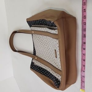 Double entry snap closure shoulder bag from Relic by Fossil. Bailey style with polka dot print in Carmel tan and black. Lots of storage.