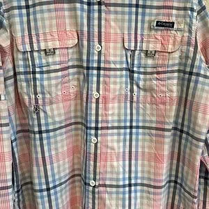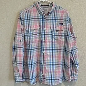 Columbia PFG pink and blue plaid long sleeve button down fishing shirt