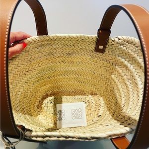Never used. Colour: Brown. Palm leaf and leather. Embossed Anagram patch in front. Adjustable top handles. Top handle or shoulder carry. Handwoven. Made in Spain. Currently $1096 tax in on loewe.com. Includes original shopping bag.