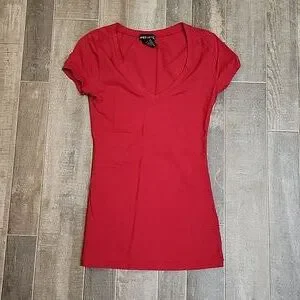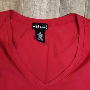Wet Seal brand womans fitted TShirt size XS measurements are 14 inches across the chest and 24 inches in length from shoulder to hem. V neckline. cap sleeves. fitted strechy cotton blend material.