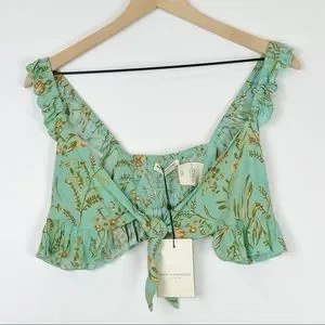 Brand new with tag Maisie top, tie front, gathered back, ruffles at the shoulders and around the bottom hem, 100% rayon.