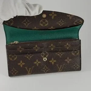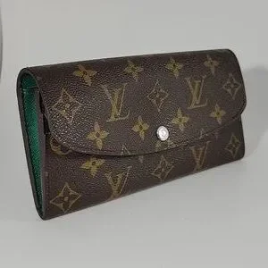 Excellent condition, Authentic LOUIS VUITTON Emilie Monogram Wallet. Coated Monogram canvas with a green grained cowhide leather lining. (4) credit card slots. Zipped coin pocket. (2) large inside flat pockets. Large gusseted compartment. Press-stud closure. Approx. 7.5"L x 3.9"H x .8"W.