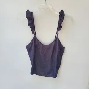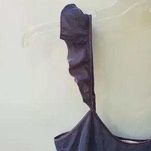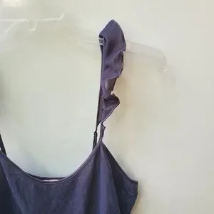 The softest velvet tank, by VS. Dark grey/purple. **Any discoloration in photos is purely bad lighting. **One tiny mark on back, untreated, price reflects. Sweet ruffles on adjustable straps. Split hem. Waistband length/long crop style. Size Med.