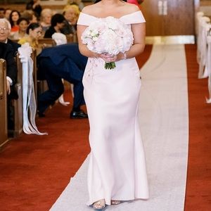 Worn once! Beautiful baby pink dress, off the shoulder- with beautiful beaded design in the front. Cups included inside.