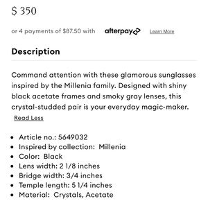 Command attention with these glamorous sunglasses inspired by the Millenia family. Designed with shiny black acetate frames and smoky gray lenses, this crystal-studded pair is your everyday magic-maker. Read Less