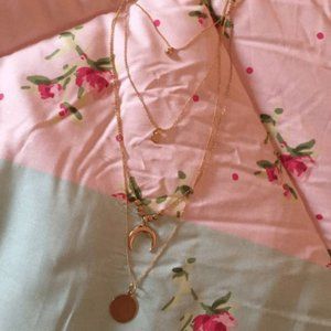 NEW long multilayer bohemian bell, coin, & gold crescent horn necklace