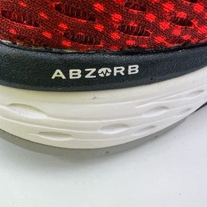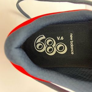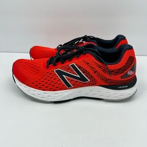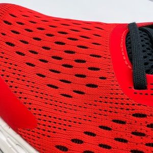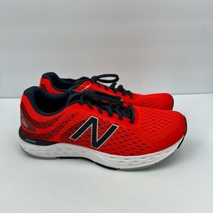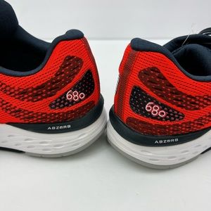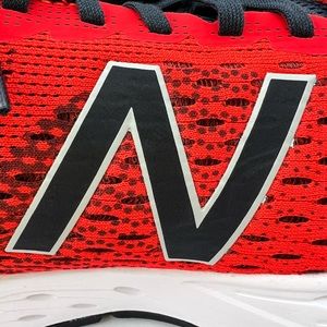 NEW BALANCE RUNNING SHOES, US MEN’S SIZE 10, TOP IS RED AND NAVY BLUE COLOR