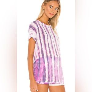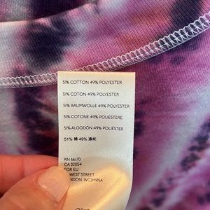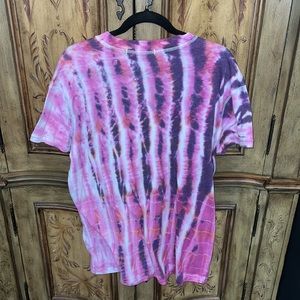 Tie dye pattern on this t shirt with contrasting stitched detail. Drop shoulders and round neckline. Size small. Bust measures approximately 24 inches and length is approximately 31 inches.