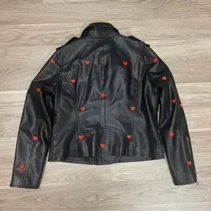 I can’t tell you how many compliments I got in this jacket! Black faux leather with red embroidered hearts all around. Silver hardware and buckles. All zippers functional. Size large.