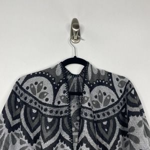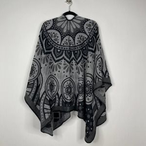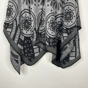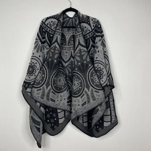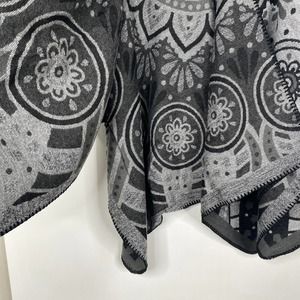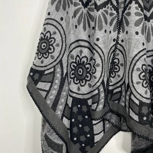 Super Cute and cozy! Bohemian chic statement fashion open front wrap around poncho with Abstract pattern. Oversized blanket sweater, Black and Gray. 52" x 58"