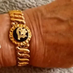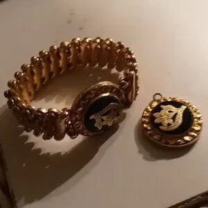 Antique very pretty 1/20 karat gold filled stretch bracelet with pendant. Onyx black stone in both.