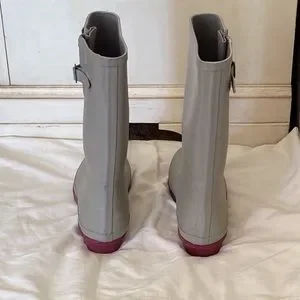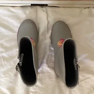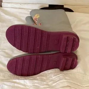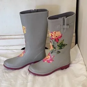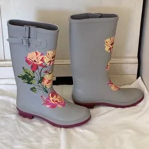 Beautiful rain boots in gray with flowers. Like new, warn once. Large-ish calf.