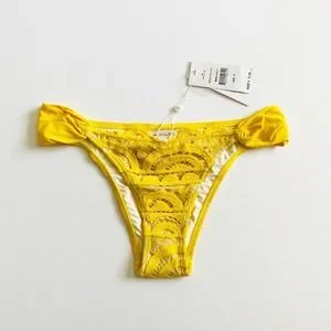 Indulge in sunny beach vibes with the Revolve PilyQ PQ Swim Women's Yellow Lace Bikini Bottoms. Crafted in a vibrant yellow hue, these bikini bottoms bring a pop of color to your swimwear collection. The delicate lace detailing adds a touch of femininity and sophistication.