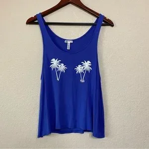 Description: Super soft royal blue tank with palm tree accents on bust.