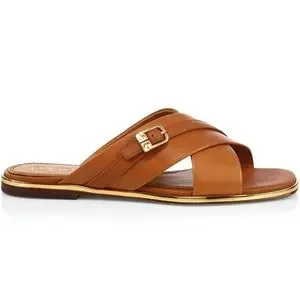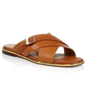 Comfortable leather slide sandals edged with polished goldtone metal and matching buckle trim.