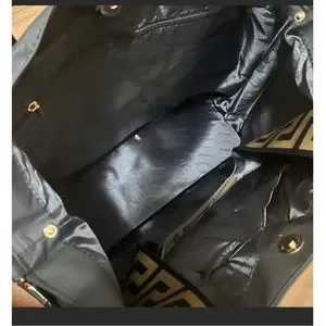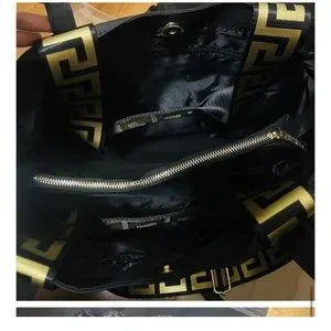 The brand new Versace parfum satchel is a spacious and roomy bag with a striking Medusa design on the front. It features an adjustable shoulder strap adorned with a Versace pattern, as well as a double set of two carry handles. One handle is short, while the other is long, providing convenient carrying options.
