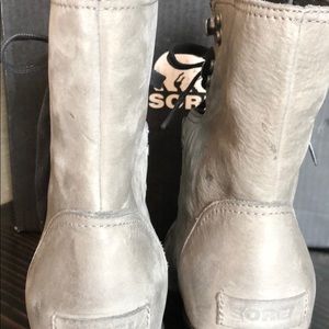 New with tag and in box Sorel After Hours Lace Boot in Quarry. I tried these boots on but they never left my closet and they are too cute to stay there! Please note that these are crafted out of a distressed leather, love it but it’s not everyone’s thing! Couple spots in the natural leather noted in pics. Please see pics to verify the condition and for details!