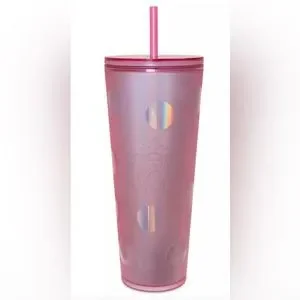 Drink in happy memories of your trips to Disneyland with this commemorative Starbucks® tumbler and straw. Featuring an allover iridescent polka dot pattern and classic Mickey Mouse silhouette, this pink cup is perfect for your next park day or Disney vacation.