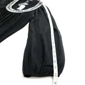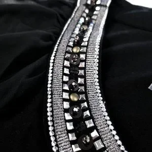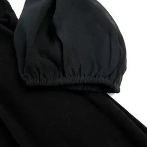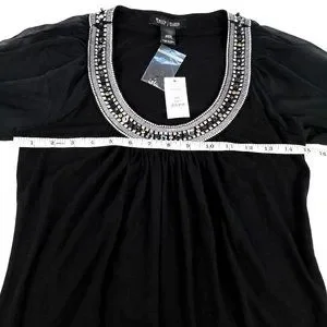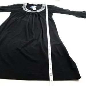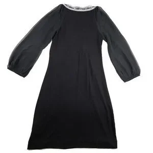 DETAILS: Jewel Neck Chemise. Mini dress. Scoop neck. Semi-sheer mesh long sleeves. Black + silver.