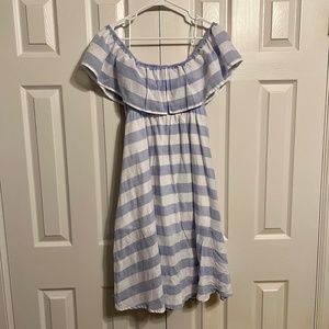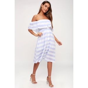 From the website: "Traverse the tides in style with the Transatlantic Voyage Blue and Ivory Striped Midi Dress! Lightweight cotton fabric, with a blue and ivory striped print, shapes an elasticized, off-the-shoulder neckline, fluttering short sleeves, and a ruffly top tier. Full button placket travels down the front to a midi-length hem. Smocked back."