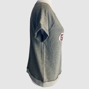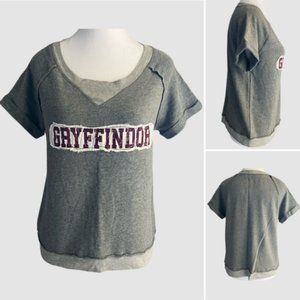 Harry potter gray short sleeve sweater shirt. This raglan style shirt features a Gryffindor patch, distressed detailing, cuffed short sleeves and a ribbed waistline. Please note: the label has it listed as sleepwear, however I wore it out as a top and never realized it was considered PJs.