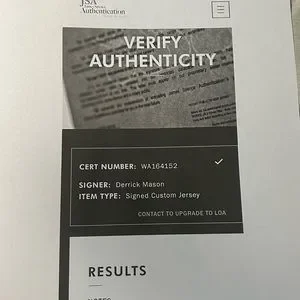 Custom on-field style jersey. Everything sewn on, size XL. Hand-signed by Derrick Mason.