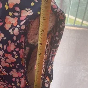 Imported. v-neck. Polyster. Measurements on the pics. Floral pattern. Indigo base color.