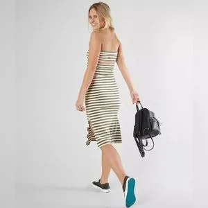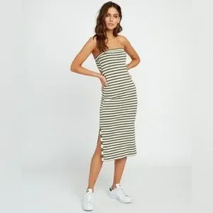 essential with a soft feel. A staple strapless dress, the Raincheck adds an allover stripe print and keyhole detail at the back. Held in place with elastic at the top and waist, the easy knit dress finds an extra touch of edge with a contrast stripe at the slit.
