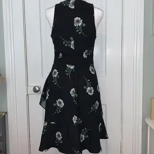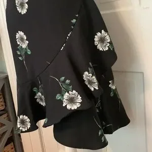 Banana Republic black dress with green and white floral print. Has a cute ruffle on on side of the skirt and at the hem. High neckline with a hidden back zipper. Knee length.