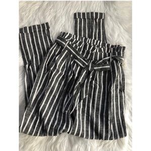 Perfect high waisted striped pants feature a paper bag waist. Slide in with zip up front.
