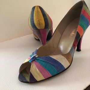 Classic stripe in raw silk silk. Slip into these and the tropics come to you. Easy to wear with jeans, for a date, entertaining or a spring or summer occasion in these elegant and eye-catching heels.