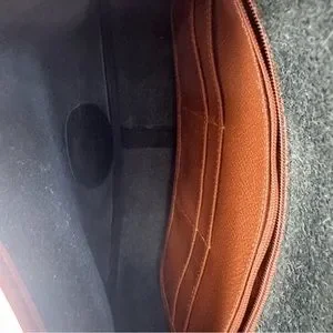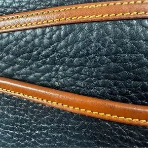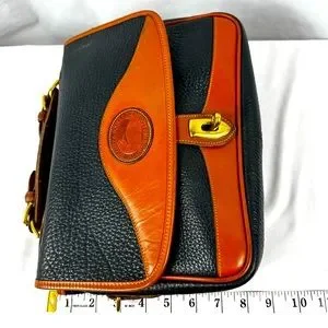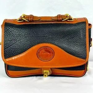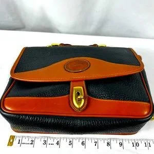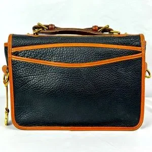 VINTAGE DOONEY AND BURKE PURSE. BLACK LEATHER WITH BROWN LEATHER TRIM. TURN KEY CLOSURE AND HANDLE ON TOP. ONE INTERNAL ZIPPER POCKET AND AN IPEN POCKET ON THE BACK OF THE PURSE. CROSSBODY STRAP NOT INCLUDED. SLIGHT WEAR AND IMPERFECTIONS DETAILED IN PICTURES.