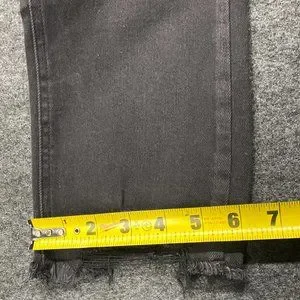 Features: Distressed details; cropped length with unfinished hem; stretch denim fabric