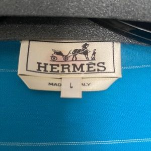 New Hermes V-neck Long-sleeve buttoned cardigan in very soft silky Cotton with a little stretch. Beautiful Aqua color with white stripes in the back. 5 buttons. Men’s Size L/Women’s XL. Extra button attached inside. Poshmark authenticates items $500 and higher. Reasonable offers considered. $1100 retail.
