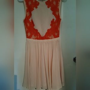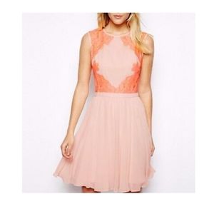 Ted Baker" vember lace" fit and flare dress. Whimsical, romantic, and bright. super flattering ,blush pink with a neon Coral\ orange lace detailing on front and back back zipper side zipper lined 100% poly trimmed in 70% cotton and 30% poly lining 100% poly.like new Size 1.Us.size XS. please check measurements.pit-pit 15 ins, waist 12.5. ins across. length 34 in