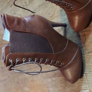 Carmel. color heel boots. Comfortable here boots. Side zipper to slip foot in and out easily. Laced up in front really makes the boat. NWOT.