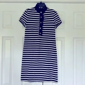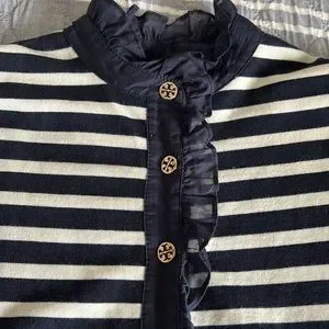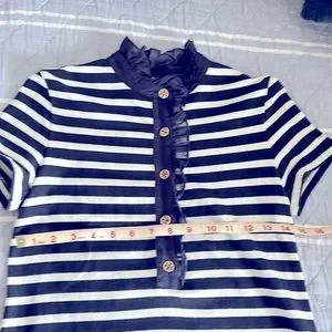 Lovely Tory Burch navy and white striped dress with ruffle trim at neck. Gold buttons, 100% cotton. Worn once or twice. Washed in cold on gentle and hung to dry. No pills or fading! Approximate measurements in photos.